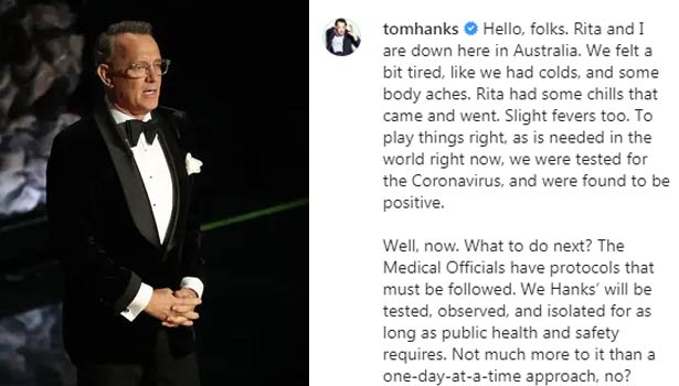 பிரபல ஹாலிவுட் நடிகரான டாம் ஹங்ஸ் தனக்கு கொரோனா இருப்பதை உறுதிப்படுத்தி உள்ளார். இது தொடர்பாக அவர் வெளியிட்டுள்ள அறிக்கையில், எனது மனைவி ரீட்டாவும் நானும் பட தயாரிப்பு பணிகளுக்காக ஆஸ்திரேலியா சென்றிருந்தோம். அங்கு சென்றதும் எனக்கு லேசான உடல் சோர்வு, சளி தொல்லை இருந்தது. அதேபோல் எனது மனைவிக்கும் காய்ச்சல் ஏற்பட்டது.  இதையடுத்து நாங்கள் இருவரும் மருத்துவ பரிசோதனை செய்ததில் எங்களுக்கு கொரோனா வைரஸ் இருப்பது கண்டறியப்பட்டது. தற்போது மருத்துவர்களின் தீவிர கண்காணிப்பில் உள்ளோம் என பதிவிட்டுள்ளார். இவர் பாரஸ்ட் கம்ப் மற்றும் பிலாடெல்பியா ஆகிய இரு படங்களுக்காக சிறந்த நடிகருக்கான ஆஸ்கார் விருதை வென்றுள்ளது குறிப்பிடத்தக்கது.