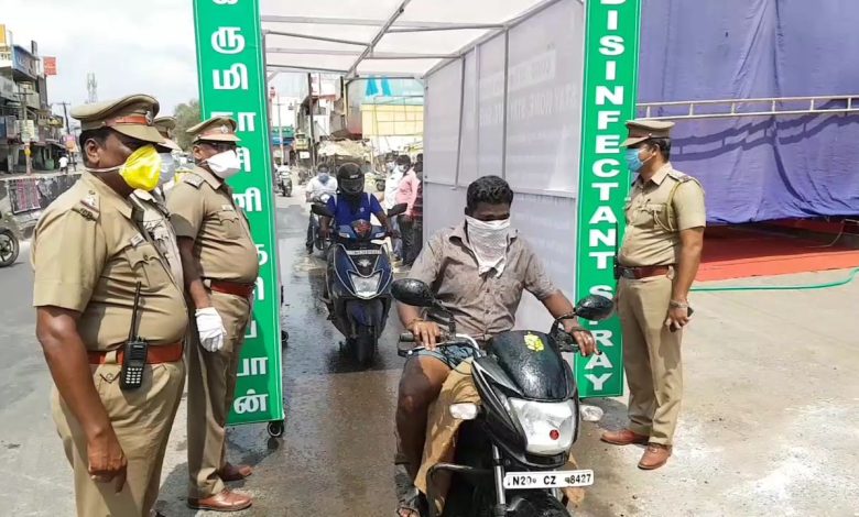 அந்த வழியே வரும் இருசக்கர வாகன ஓட்டிகளை இந்த அறைக்கு உள்ளே வரவழைத்து அவர்கள் மீது கிருமிநாசினி தெளித்து அனுப்பி வைக்கப்படுகின்றனர்.