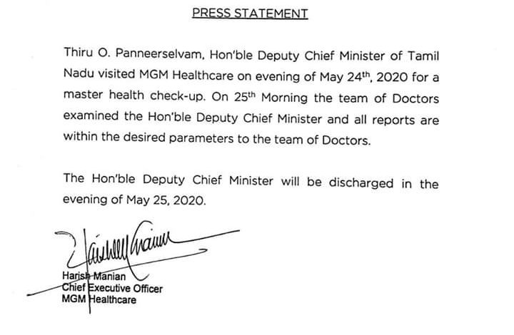 முழு உடல் பரிசோதனைக்காக மருந்துவமனையில் அனுமதிக்கப்பட்டிருந்த துணை முதல்வர் ஓ.பன்னீர்செல்வம் இன்று மாலை வீடு திரும்புவார் என மருத்துவமனை நிர்வாகம் அறிக்கை!
